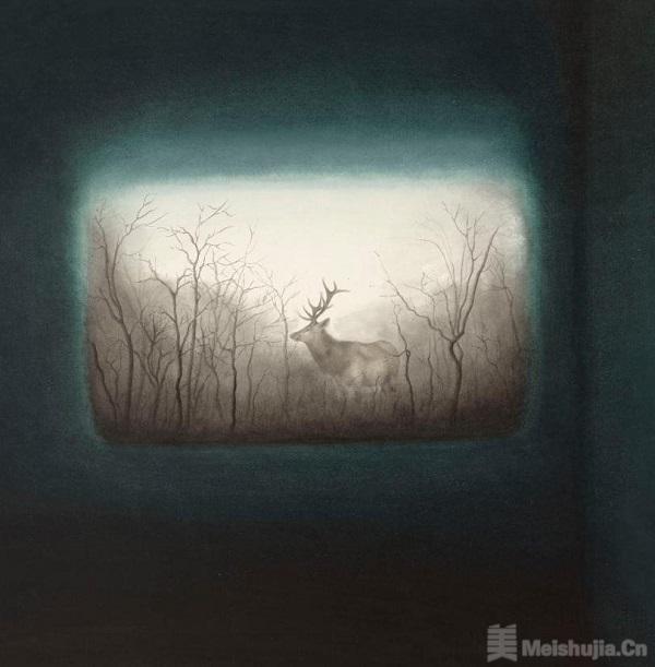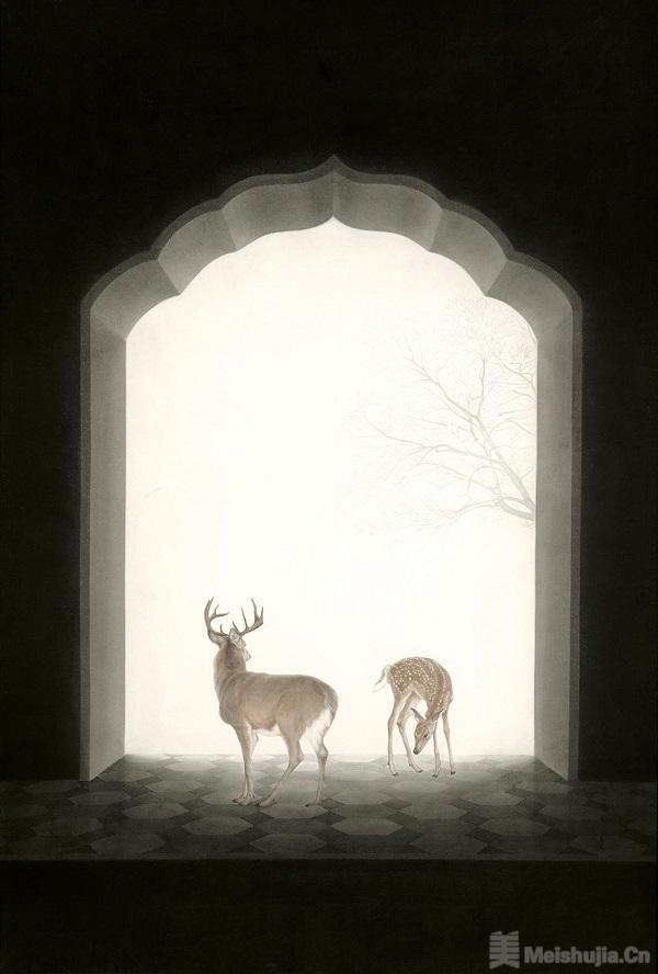 秦艾的画素来喜欢以动物作为主角,尤喜麋鹿。在她虚构的多重空间内,那些动物好似拥有人类的情感,做着和人类相像的行为。画中动物的澄明眼神向我们透露出秦艾以动物作为人类化身的信息,意在暗喻:另一个平行世界的人类或许并不如自身的想像般强大,并藉以逃避现实的迷惘。例如在作品《众妙之门4》中,麋鹿与梅花鹿站在拱门之下含蓄和隐约的互动,便很能揭示这种喻义:在中央的光源里,她们或许要面临的是一个交叉点的决择,从中点出人生的困惑。但艺术家总爱在作品中带点光源,这会自然的与“阴极生阳”的东方哲学相连接,喻指:在黑暗中看见光就如看到希望。