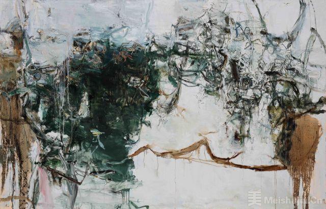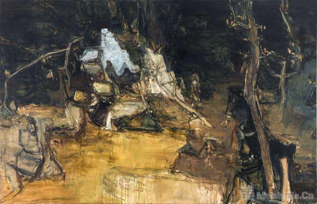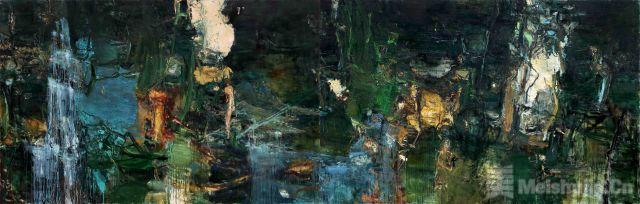 如果说早期在“植物系列”中尝试的美学个性转向依然难以摆脱具象绘画与西方式绘画视觉下的“真实风景”,创作于 2012 年的《梦与睡眠结伴》则表现了艺术家撷东方传统——元代赵孟頫“以书入画”的方法论与文人画中的抽象精神——以直接的书写性的参与破坏造型,思考绘画本体与表现手法之间的内在关系。个体身处于时空关系中的心理化体验与记忆自南北朝谢灵运之山水诗起便构成了东方独有的景观视野,而屠宏涛通过对同一风景反复覆盖式的描述重新安排时间之流逝,让时间在作品中得以回溯,捕捞诗意与变化本身。