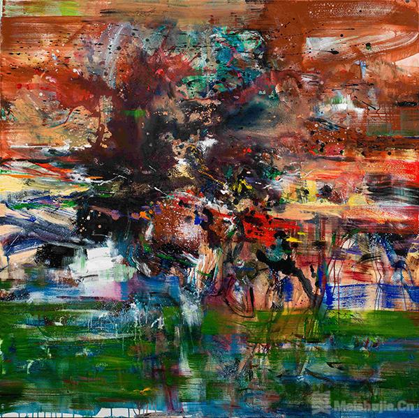 「象外之象」出自唐代诗人司空图,意指诗学中表现精神蕴涵和意象之美的艺术境界,言已尽而意无穷,正反映出陈伟邦在中国古典美学上的极致追求。西方抽象油画结合中国山水若有若无、似虚似实的诗意,成为他在中西方艺术探索和绘画实践中炼净出的总结。