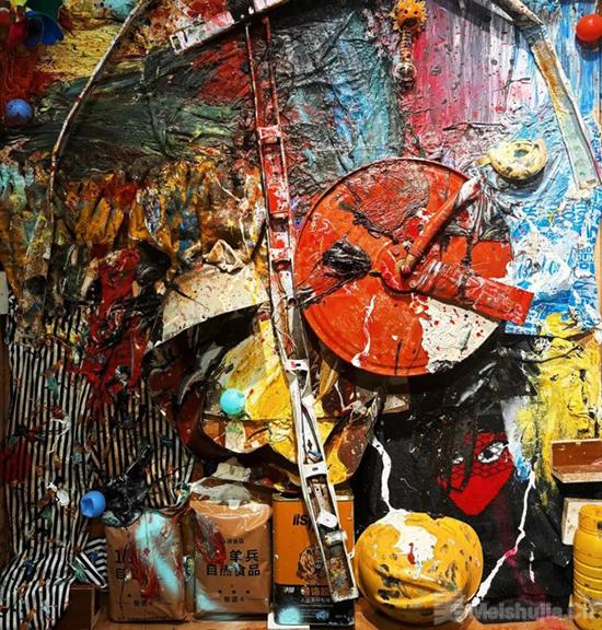 在王易罡的艺术世界里,“空气罐头”不仅是意象符号,更隐喻着被知识体系禁锢的创作生命力。他以打破常规的勇气,将身体转化为最具力量的“画笔”。在“悬吊绘画”系列作品中,艺术家主动摒弃视觉主导的创作逻辑,以“无目视创作”的激进方式,让身体在重力牵引下与颜料、空间展开即时对话。飞溅的色点、流淌的油迹、交错的色块不再是刻意设计的产物,而是潜意识与身体记忆的本能释放,每一道痕迹都成为挣脱艺术枷锁的鲜活印记。