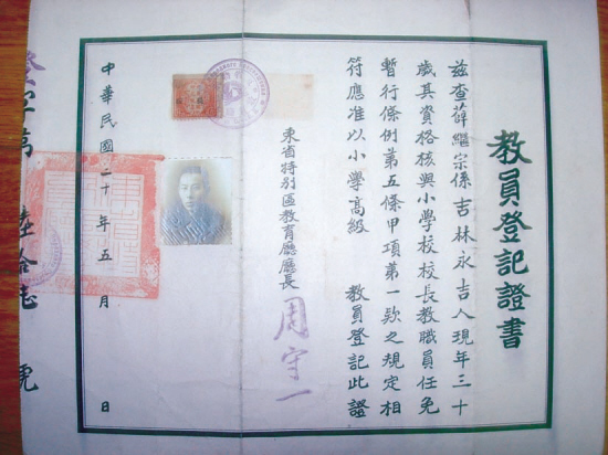 证书上写有“兹查薛继宗系吉林永吉人,现年三十岁其资格核与小学校校长教职员任免暂行条例第五条甲项第一款之规定相符,应准以小学高级教员登记此证”,后面是登记教师的照片。证书的左上角贴有印花税票。据詹洪阁介绍,当时的毕业证以及正规聘书上都贴有印花税票,体现该证书是被国家承认的。
