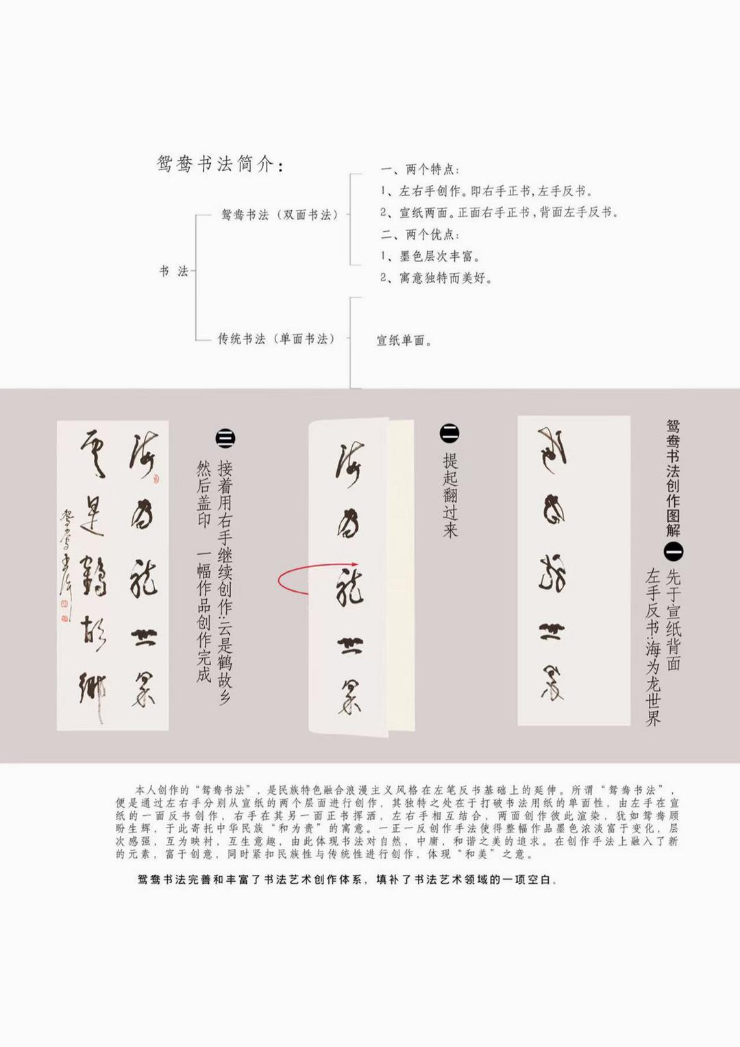 鸳鸯书法打破几千年来固有的书法创作形式,使书法创作从单面创作上升到两面创作的高度,把书法创作用纸发挥到了极致,彰显了水、墨、纸相互间的艺术魅力,流淌着两者的血脉,血指墨,脉为笔。即正反两面(一阳一阴,一天一地)你中有我,我中有你。一切都在天地间。它们相互渗透,互相容和。赋予了作品新的生命,使得墨色层次更加的丰富和变化。