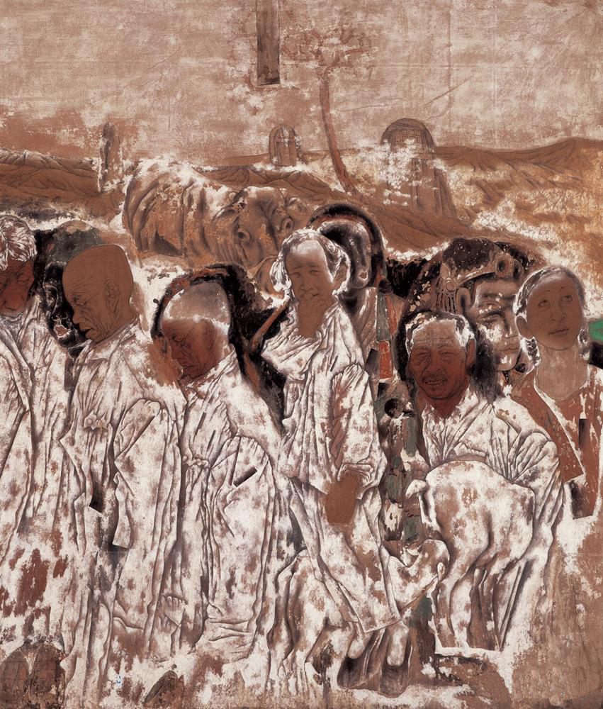 中国工笔人物绘画堪称中国画之祖,源远流长,形成了一整套的程式和技法,如果在继承中没有创新,这一画种也必然走向穷途末路。唐代工笔人物画所达到的高度成为后人难以逾越的高峰,阎立本、李道昭、韦偃、张萱等一大批工笔人物画家和他们的传世之作也是后代工笔人物画家必需临摹学习的。对古代壁画及唐宋元明清优秀传统绘画的临摹,勇力是最严谨的,他要求自己最好跟原作一样,把自己约束在最大的法度之内,最大的约束也是最大的施放。但是,在临摹经典绘画,感受、体悟古人绘画技法语言真谛的同时,他还带着“邪门”思维理念,从共性的笔墨技法语言的探索走向个性的笔墨技法语言的发挥。20世纪80年代末,唐勇力开始了对工笔人物画技法方面的研究,或者说他有这种研究意向的时间还要早,但他的技法表现在作品中是始于此时的。一种技法将会产生一种绘画风格,这在勇力的作品中也能看得出,他的“脱落法”和“虚染法”从酝酿到产生都带着明显的写意色彩,但这两种技法在操作中同样也具严格的程式化,勇力是在法与意、法与理之间寻找统一平衡的,技法的真正意义还在于它仅仅是一种桥梁,画家的本意还是通过法来表达意。这一过程在勇力而言是艰辛而漫长的。在《汲水图》(50cm×70cm,1990年)中,我们可以看到虚染法绘画带来的朦胧趣味。工笔人物画的写意性也凸现出来,在人物造型上明显与20世纪80年代拉开了距离,这也是他另一种绘画风格的雏形,是一种崭新的绘画语言,他20世纪80年代的作品用形式感来表达写意性,现在他开始用造型理念和题材来表达。但是,在这幅作品中虚染之“染”还不是一种独立的语言因素,还处于一种模糊状态,技法的不完备、不彻底在一定程度上影响了绘画的表现力。这也是勇力在技法探索中艰辛的一面和必要的过渡过程。