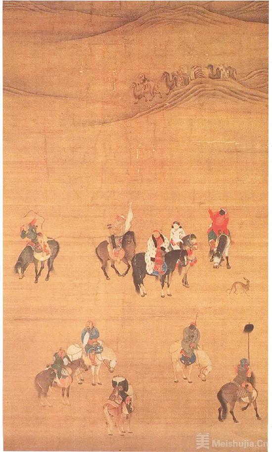 元、明、清三代的服饰虽各有差异,但不变的是对“秩序之美”的追寻。《元世祖出猎图》中,忽必烈的白色金锦袍上,缠枝莲纹与回回锦的联珠纹相映成趣,金丝在石青底色上织就“江山万代”的隐喻;明代唐寅的《王蜀宫妓图》里,女子的“三白妆”搭配“比甲”短衣与马面裙,上紧下宽的剪裁既合江南仕女的纤巧,又暗合《明会典》“士庶服饰毋得僭越”的规训;清代的宫廷绘画中,经常出现官员的石青补服与皇帝的明黄龙袍,在湖光山色间构成“黄为尊、青为贵”的色彩秩序。