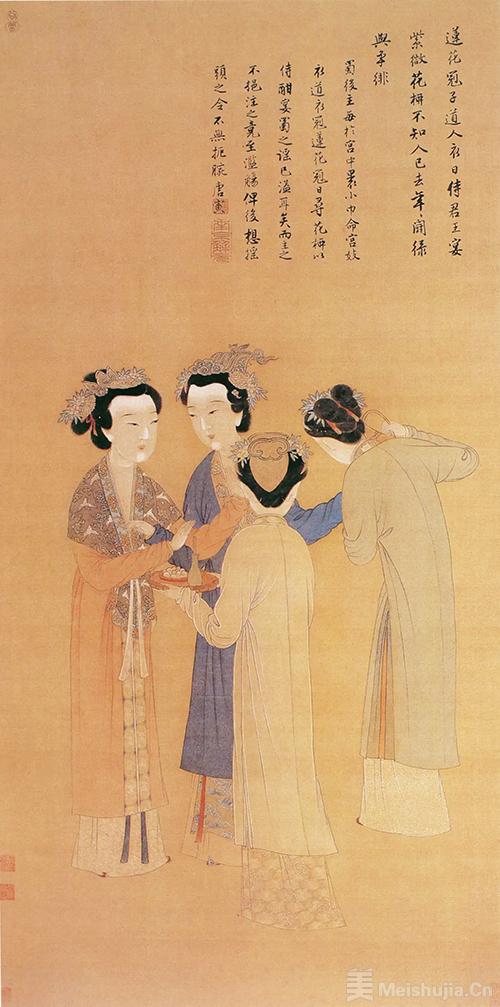 唐代的服章之盛在周昉的《簪花仕女图》中绽放极致:斜领大袖纱衫如蝉翼覆体,透映出丰腴体态的柔美曲线;高髻簪花、蛾眉朱唇的妆饰与宽博飘逸的衣袂,构建起唐代贵胄女子“绮罗纤缕见肌肤”的审美范式。