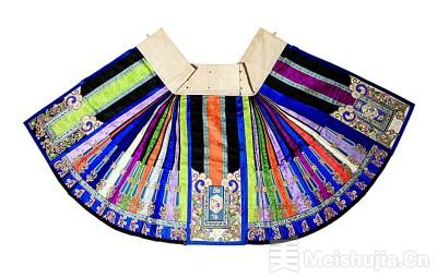 清代是马面裙发展的繁盛期,裙型有阑干、月华、凤尾、百褶鱼鳞等多种式样,且极重视前后马面部分的装饰。裙身多以刺绣点缀,常通过打籽、戗针、平金银等针法饰游龙飞凤、人物地景、蝶恋花等纹样,华美绚烂。
