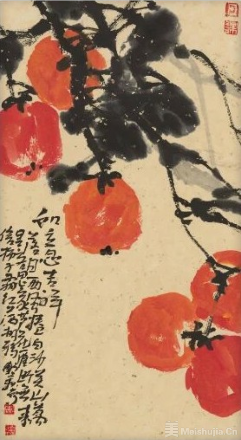 在技法层面,马卫巍的用笔用墨已达相当境界。他深谙中国画“以书入画”的精髓,每一笔都蕴含着书法的韵律与节奏。观其墨葡萄,藤蔓缠绕如草书飞白,果实晶莹若楷书点画,整个画面既是物象的再现,更是笔墨的舞蹈。这种对笔墨的高度自觉,使他的作品超越了简单的形似,达到了“不似之似”的妙境。他的柿子系列,以简练的笔触勾勒形态,以微妙的墨色变化表现质感,看似随意,实则每一笔都经过精心经营,真正做到了“意到笔随”的自由境界。
