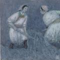 垛草(油画) 80.2×100.4厘米 1991年 妥木斯 画家妥木斯曾说:“艺术是心灵的归宿。”他的艺术探索,也始终围绕着“归心”这一主题展开。他的作品,无论是早期的写实风格,还是后期的意象化表达,都透露出一种对精神家园的寻觅。这种寻觅,既是个人的,亦是民族的。他笔下的草原,不仅是地理意义上的内蒙古,更是文化意义上的精神原乡。 作为内蒙古成长起来的著名油画家、美术教育家,从20世纪