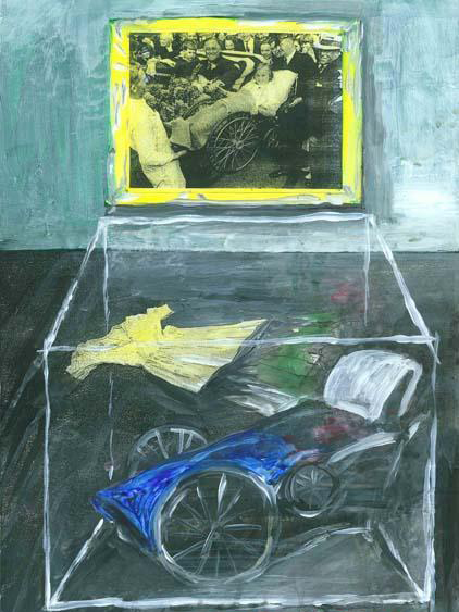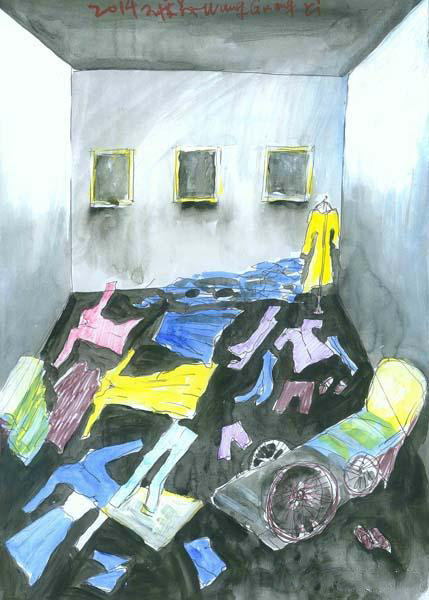 我想在这件作品中表达关于政治、信仰以及灵魂转世等问题的思考。我通过玻璃柜中悬挂的衣服等物品,试图制造中一种大型卖场的景观。也在提示现在的大众,当你在商场见到无数的服饰物品时,你也许正和当年那些信仰者的灵魂不期而遇。