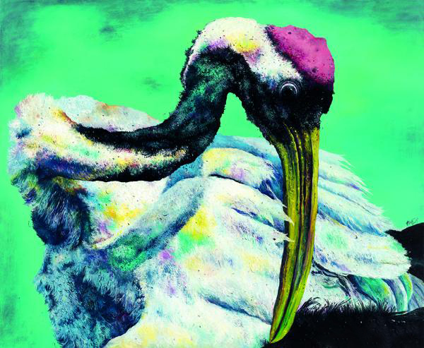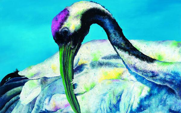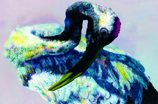 无论“鸟”,还是“花”,都是似是非是的。在我看来,曹卫国笔下的鸟”和“花”都是“变异”了的。他笔下的鸟似鸭非鸭(似鸭又似吉他),似“鹤非鹤(似鹤又似鸵鸟)。时而“俯首弄骚”、时而“孤芳自赏”、时而“呆若木鸡”,时而“冷眼旁观”……可以说,其既是“自我歌吟”,也是“自我嘲讽”,亦是“自我鞭策”。他笔下的“鸟”如妖娆之美女,又如孤寂之荒原狼。既可谓心目中的理想情人的写照,也可谓“此时”自我生存状态的写照。