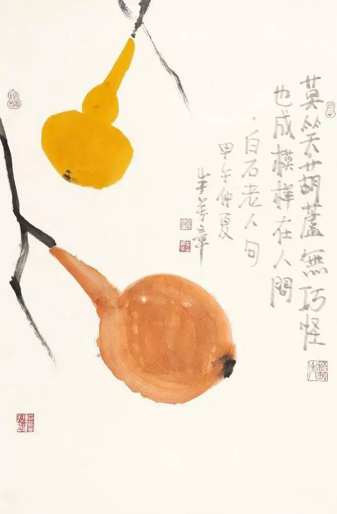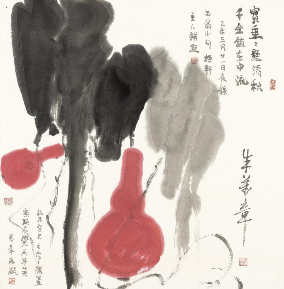 朱万章先生的葫芦大笔粗毫,色彩明丽,稚拙天真,充满文人意气,趣味盎然。以心运笔,以意为尚,结构章法头头是道,颇有以笔直抒胸臆的风神。