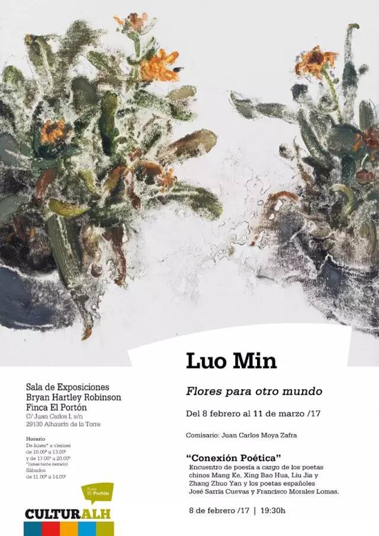 “它界之花”罗敏个展将于17年2月8日在西班牙马拉加阿劳林罗宾松文化中心开幕。时间:星期一到星期五上午10-13点下午17-20点星期六11-14点。地址:阿劳林-托勒、胡安-卡洛斯一世大街。策展人;胡安.卡洛斯.摩亚.