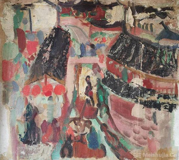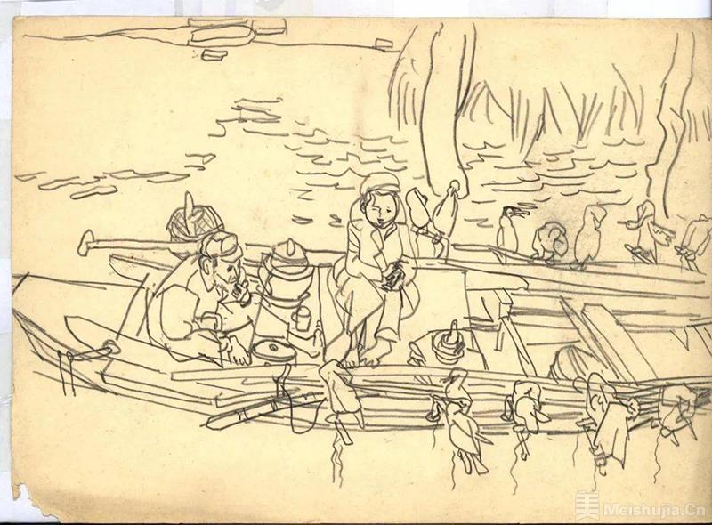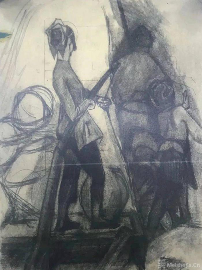 我坐在学生宿舍的上铺,在暗淡的灯光下,浮想联翩。很快便用杂乱的钢笔线画满了四十公分见方的稿纸。这样一张毕业创作的稿子立刻为董希文老师肯定了。满纸错综的钢笔线表示了我对家乡人民深切的怀念。我又用更小的纸,画了几张局部人物的素描和一张只能提供一点启发的色彩小稿,便完成了我的毕业创作的全部准备工作。往大布上画去,已经急不可待。真是幸运,我为自己借到一间藏有大量中国古代雕塑复制品的陈列室作画室,有霍去病墓前的卧虎陪伴着,作画便更大胆了。