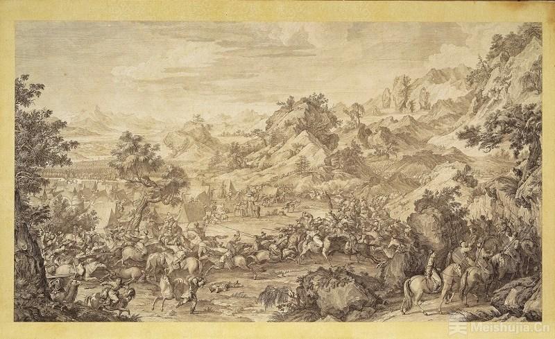 整件作品从绘稿到印刷历时13年,全套共包含16幅铜版画,配以乾隆帝亲笔序文、题诗和臣工跋文的木板刻印,共计36幅。战图采用全景式构图,场面辽阔,刻画细致入微,体现了当时铜版画制作的最高水平。
