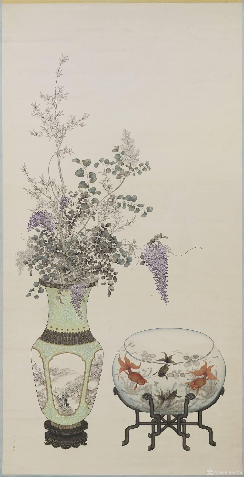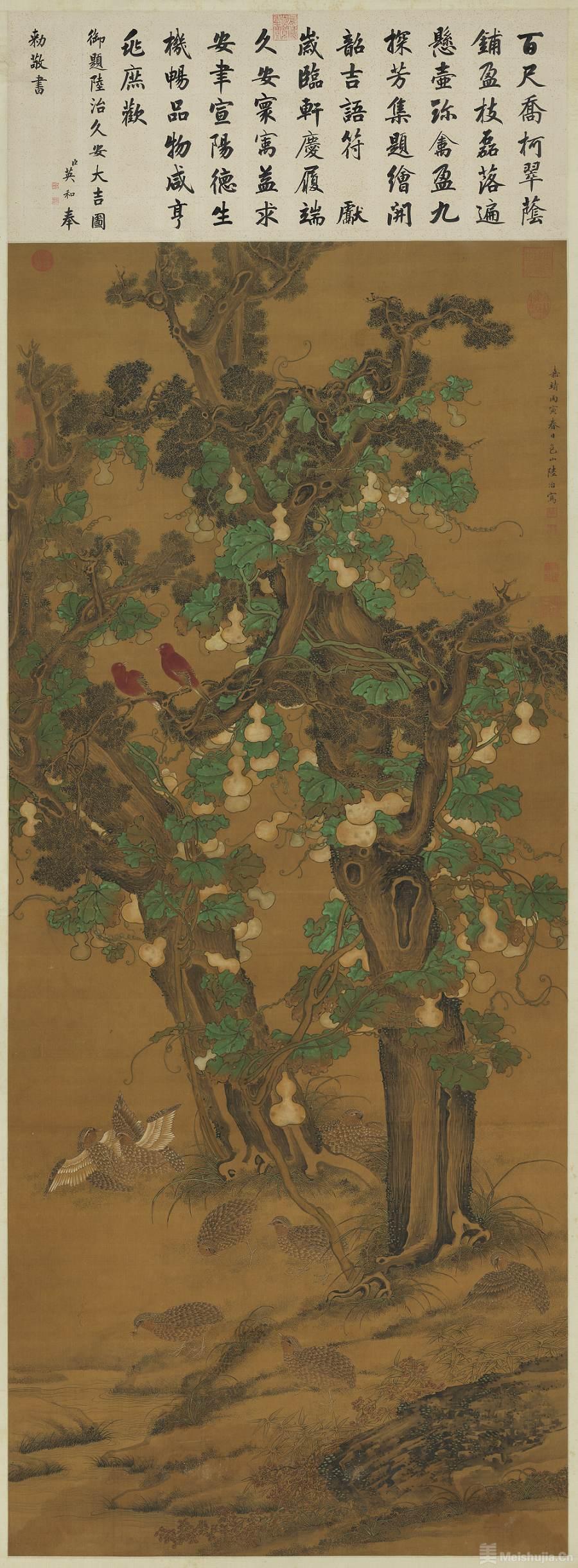 陆治(1496-1576)为吴县(今江苏苏州)人,山水受吴门派影响,同时汲取宋代院体和青绿山水之长,用笔劲峭,景色奇险,意境清朗,自具风格。这幅画作绘有九只鹌鹑,另有葫芦、朱雀、柏树等吉祥意象,表达「久安大吉」的美好寓意。