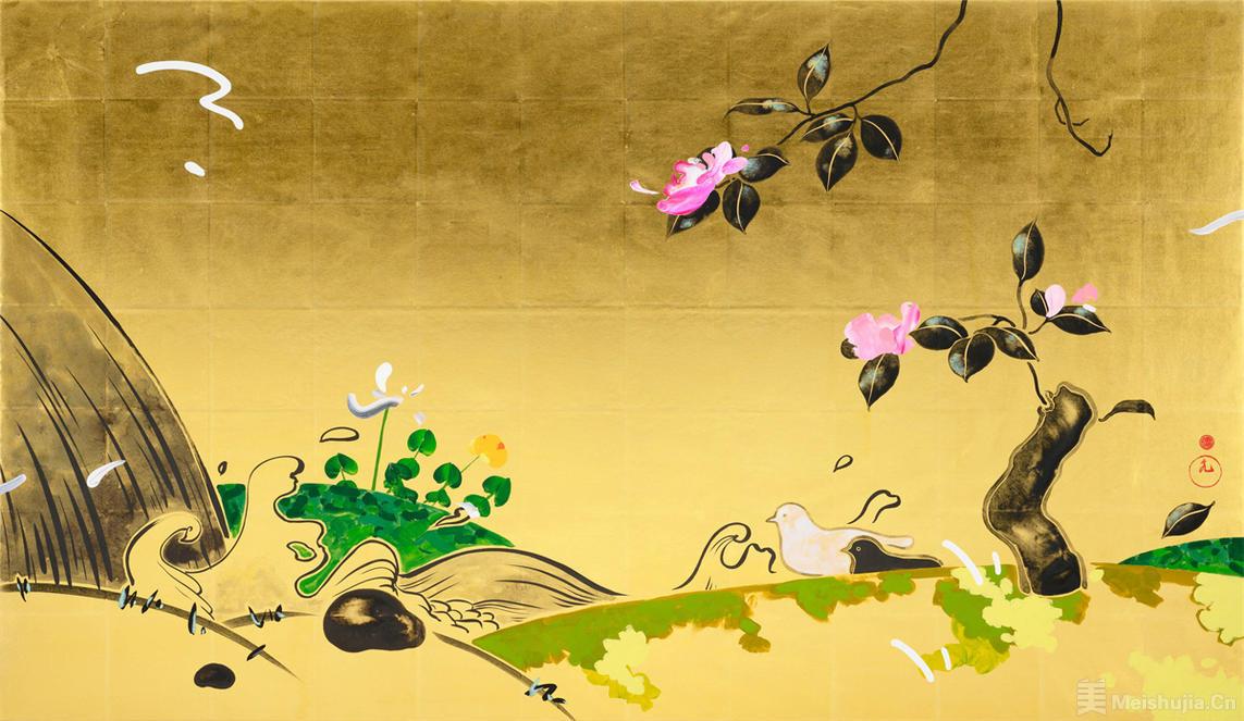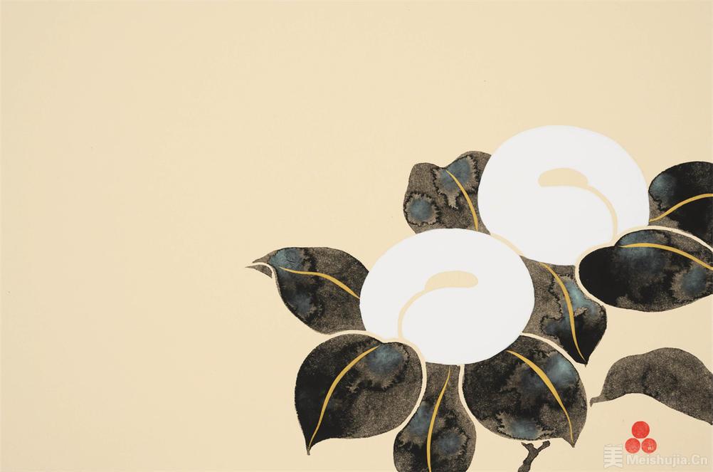 因此,在品川亮的繪畫中常見以金泥為底、花卉植物為題材,強烈的裝飾性、將花卉符號化等日本畫特徵,如:簡約化的《白椿》圓潤可人,而融入抽象線條的《櫻圖》、《松圖》則富流動感等,他筆下的花卉不盡然彰顯極盛之美,也取其由盛開至凋零的時刻,展現生命週而復始的輪迴。