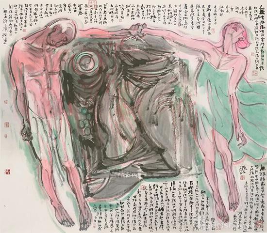 创作于2008年汶川地震之后的“殇·戊子记忆”“生命·墨语”系列,惨烈的人间悲剧、陡然面对的生死体验和随之喷涌的大爱之情,是此系列创作的情感源头。他回避了对灾难事件的叙事性描述,而是将大量的肢体或漂浮、或升腾、或曲卷、或僵直的搁置于如天地洪荒般的抽象空间之中,诗性的、意象化的传递出对生命、对生死的终极追问。以诗性的语言化解了生命逝去的疼痛,以一种向死而生,置之死地而后生的方式,倒逼着人的觉醒,传达着对生命的渴望。
