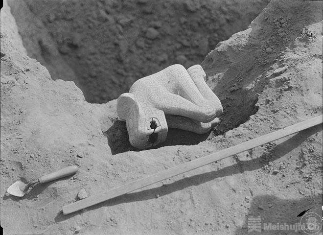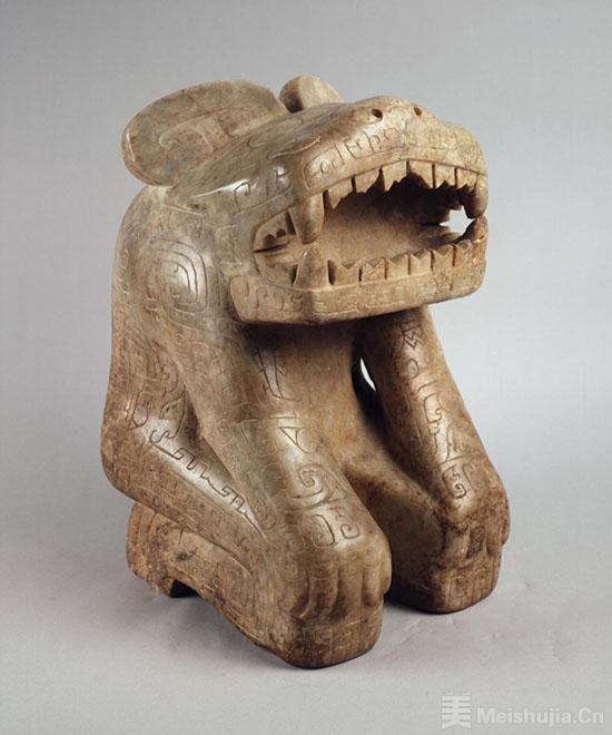 这件大理石虎首人身立雕高37.1厘米,重28.5公斤,石质晶莹、雕刻细致,充分显现殷代大理石工艺的发达,是殷墟出土器物中最为精美的石雕之一。