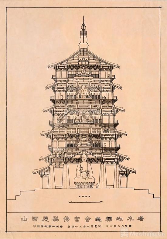 (2/6)山西应县木塔剖面图,梁思成、莫宗江,1935年,复制品,中国营造学社纪念馆藏