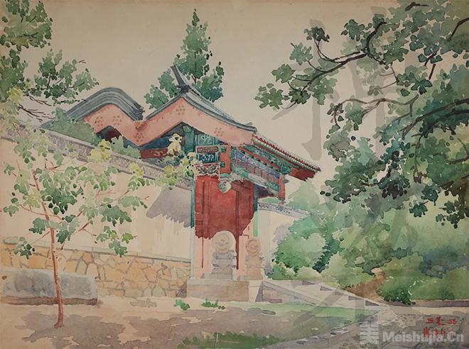 (6/6)《谐趣园霁清轩门》,梁思成,1955年,水彩画