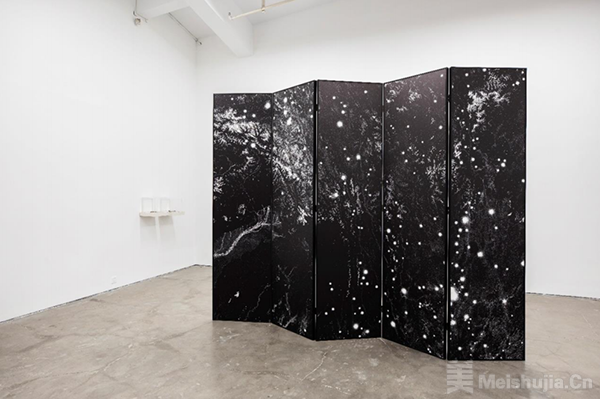 另一方面,陈萧伊创作则是关注于地质时间尺度,选在横断山脉进行了探索与创作。创作起点位于废弃矿区,如今多为悬置的空间。在作品《横断地星图》中,她的绘图笔尖标记了矿床,通过东方屏风装置创造出一个让人联想到星空效果的作品。《俯瞰者》系列中采用了一种类等高线图的制图方式,同时标示出被遗弃的小径,在追踪这些稀疏和密集的线条中彷佛看见人类的指纹而有了温度。这些创作过程中能感受到艺术家的手,传达了一种与土地连结的复杂性。在《残响指南》中,她更进一步提出声音可能是制图过程的一部分,经常在这些广阔的山脉制图过程中体悟到。在试图藉由这些作品描述山区经历的变化,悬置空间所呈现的荒芜曾经有著人类的足迹,这些过往移留下空也如同地图上的空白,经艺术家个人的制图有了新的存在的形式。
