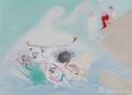 在这个展厅的另一边,几张名为《白月》、《春晓》、《天浴》、《润物》的作品,描绘了仲夏“天宫”里另一种情形:它和白蛇传同样取自于神话,却成为“爱情”与“人间仙欲”的写景与移情。它们有着相似的意境,夜空被抽象成点点星星,天河宛若一条深蓝色的缎面,人间与天宫坐落其间。
