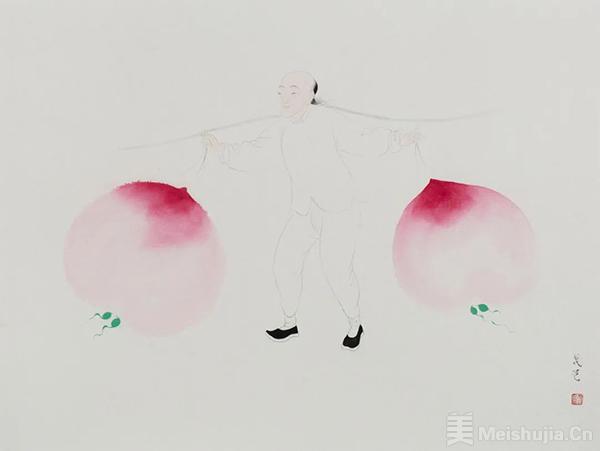 其次,古语中的“食色性也”,意喻着桃和人的本性有关。在古代有限的吃物里,夏日的幸福之一,便是尊崇节气,开始赏桃、尝桃、品桃。于是,桃子在古画和古书里随处可见,它独特的外观和口感,总是能勾起武艺的画欲,粉红的桃尖,含苞待放,娇羞地有那么一抹浓粉。细微的桃毛,柔软鼓胀的手感,有着接近皮肤的质感。它的口感更是极佳,多汁、鲜嫩,如若经井水清洗,那种清凉,那些桃汁流的满手都是。