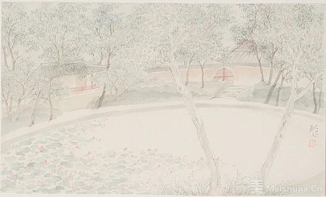 近年来她不断开拓山水画的题材边界,其着力甚多的园林绘画,颇受各方称誉。郑文的园林绘画虽以江南文人园林为灵感核心,但其设色既融合了传统文人画的雅致又渗入了当代都市审美趣味,形成了富于抒情性的诗意色彩语言。郑文以“素雅”为基调,摒弃浓艳,追求含蓄的文人意趣。她常以白墙青瓦、栗色门窗、灰绿草木等低饱和色系构建画面,力求还原江南园林“白描般素净简淡”的江南诗性的视觉特质。郑文身处上海这座国际化现代化的大都市,令她得以借助更为开阔的中西文化视野来反观自己的创作。因此,她的当代园林绘画充满上海这座国际性大都市特有的调性,时尚雅气,与传统绘画的韵味也颇相契合,毫不违和,是中西融合的成功案例。