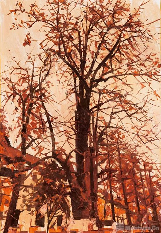 “念山”板块,展出系列油画作品近180幅:《江水泱泱》将逝者如斯的咏叹被转化为生命汹涌的宣言;在《云山苍苍》中,可见凝固的雷声、大地凸起的筋骨;《龙泉苍松》尽显坚劲,《大树参天》吐纳雄浑;《十里银杏》璀璨如金,《神仙山居图》超然物外;最终,《谿山新旅图》带领观者完成一场贯穿古今的精神行旅。