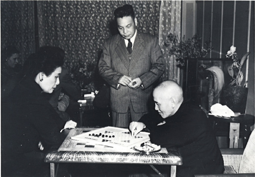 蒋介石夫妇下跳棋,蒋经国站着观棋。联合报图