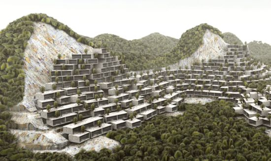 通过草图、模型和效果图,观众们可看到由MVRDV(首尔的“疑似911”建筑“云阁”的设计者)担纲设计的柳州龙潭公园,2004年开始动工,2006年放弃建造。这家荷兰建筑师事务所欲打造一幅“垂直村落”图景,嵌入喀斯特山脉的石灰岩层(周遭岩层构成村落的一部分),在这片画意盎然的风景中,每一混凝土居住单元都构成一颗小像素。“一石二鸟”的设计意图既可为该地区迅速崛起的中产阶级提供住房,又可减缓岩壁的自然侵蚀。还有amphibian Arc的深圳国投广场改造计划,于2010年开始不久后便结束。原计划将一个规划不佳的过气购物商场建成一个光华照眼的公共艺术空间,拥有便捷的行人交通和修饰一新的建筑立面——还有带65英尺高人造树木的山姆会员店(Sam's Club),其拉伸膜和钢质枝杈将为顾客提供荫凉和头顶的璀璨。还有UNStudio钢阵排布的大连足球场,Spark光辉惹火的“上海之吻”,我们都无缘见到他们实现后的真身了。