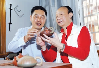 年过七旬的吕尧臣,从事紫砂壶艺创作半个世纪,新品层出,风格韵秀而古朴,尤其是独创“吕氏绞泥”出神入化,堪称一绝,有“壶艺魔术师”之称。作为一位民营企业家,高仕军怎么会与紫砂大师结缘呢?在拜师仪式上,高仕军道出了其中原委。他说,自己一直很喜欢紫砂文化,紫砂壶是泡茶的佳器,外表质朴,光华内敛,体现了非常丰富的内涵。而吕尧臣则是他所敬佩的紫砂大师,不仅壶艺精湛,而且在艺术之路上极具创新精神,创造了一个美丽的紫砂艺术世界。这种锐意进取的创新精神,其实也是高力集团一直所倡导的。高力集团在不长的时间内,就名列中国企业500强、中国房地产企业200强、中国民营企业百强,之所以能取得今天这样的成绩,一个重要因素就是大胆创新。这也正是他的拜师动力所在。高仕军的好友唐国强见证了拜师全程,他勉励高仕军要将大师的紫砂文化精髓融入企业运营中去,做强做大高力集团。
