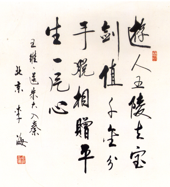 他品行高洁,德厚持重,他常说的一句话是:想写好书法,必须先学好怎样做人。虽说李海的书艺精湛,造诣深邃,但待人接物总是态度和蔼,谦虚谨慎;碰到求教的人,他总是循循善诱,诲人不倦,不厌其烦地答疑解难,时常和喜爱书法的朋友们在一起探讨笔法,有时边说边用笔在宣纸上做示范。多年担任书法老师的他,在教学上毫不保留地传授学好书法的经验、体会、诀窍,深受学员欢迎和敬重。