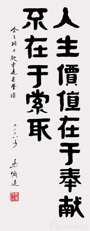 马识途书法艺术具有突出的社会责任价值。马识途淡泊名利,积极履行社会责任,时时刻刻体现出一个老党员、老艺术家的闪亮本色。马识途曾两度拍卖自己的书法作品,所得善款数百万元,悉数捐赠给四川大学,设立“马识途文学奖”,襄助学子圆梦文学。马识途的书法作品,多是赠送,其中为学校和各类纪念馆的题词很常见,还有更多的题词是对后生晚辈出版著作、开办展览或其他方面的鼓励。不敝帚自珍,不待价而沽,不高不可攀,马识途的书法事实上也是文化惠民的有效范式。山高笔为峰,马识途的心中艺术家的社会责任就是一座“高峰”。