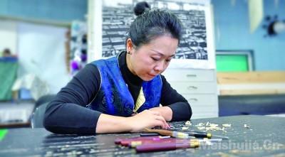 (3/5)青年版画家董鸣在大庆市美术馆版画工作室创作版画。王翠摄