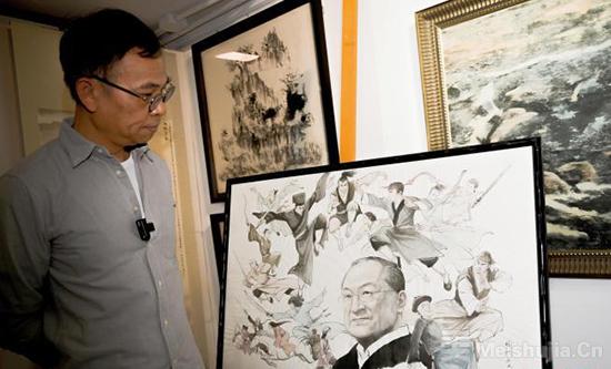 李志清的工作室不大,四壁却挂满了他创作的武侠人物和山水画,其中与金庸作品有关的画作占了大多数。工作室一个书柜的最高处,摆放着一张他与金庸的合照。